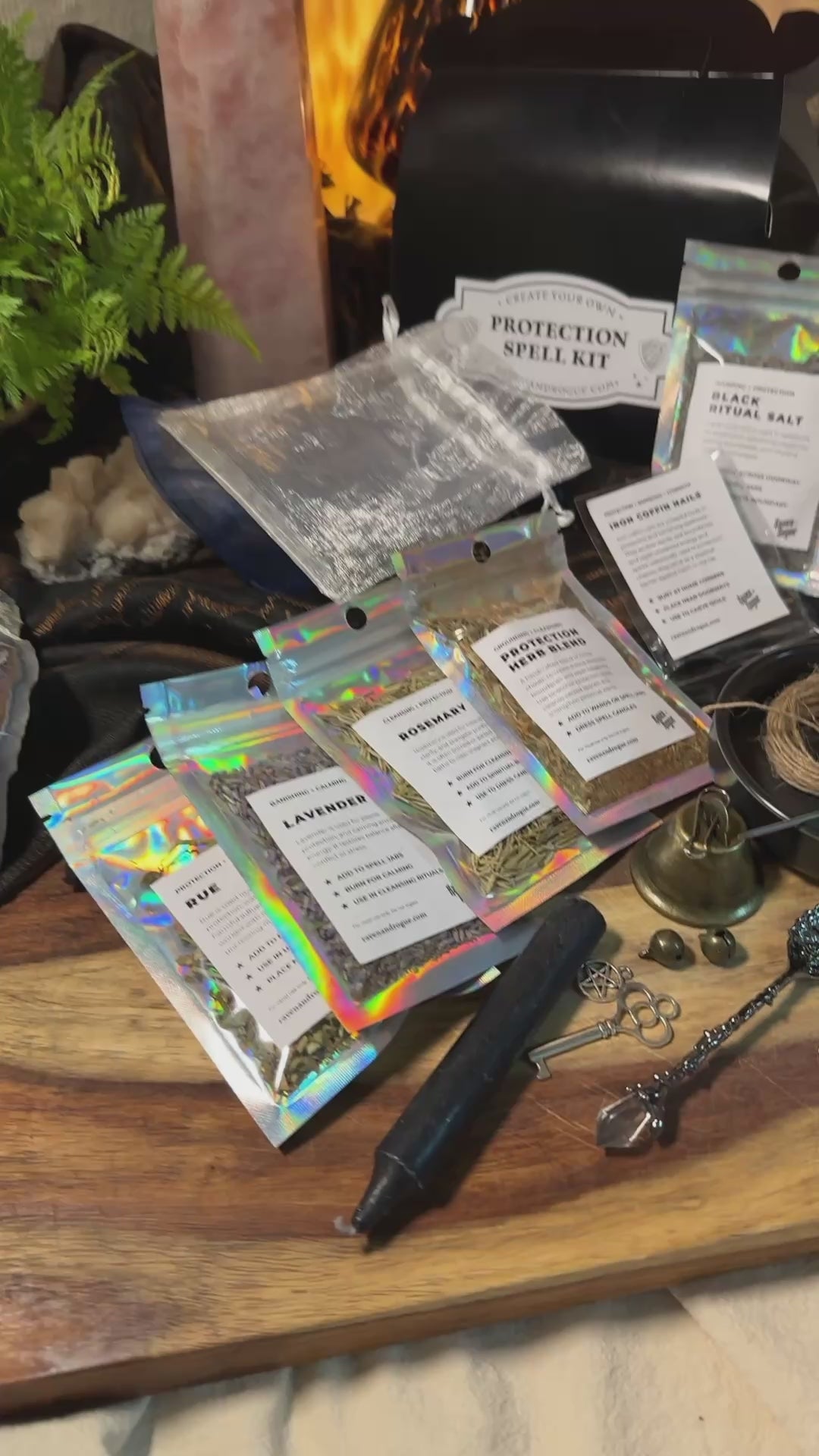 Raven and Rogue Protection Spell Kit components spread on a wooden surface. Holographic pouches labeled Rue, Lavender, Rosemary, and Protection Herb Blend fan out on the left beside a black carving tool. Center shows a black bowl with twine and carving needle, brass bell, key charm, and black tourmaline chunks. Right side holds a white chime candle, tealight, corked bottle, two gold dropper oil vials, selenite wand, and parchment cards.